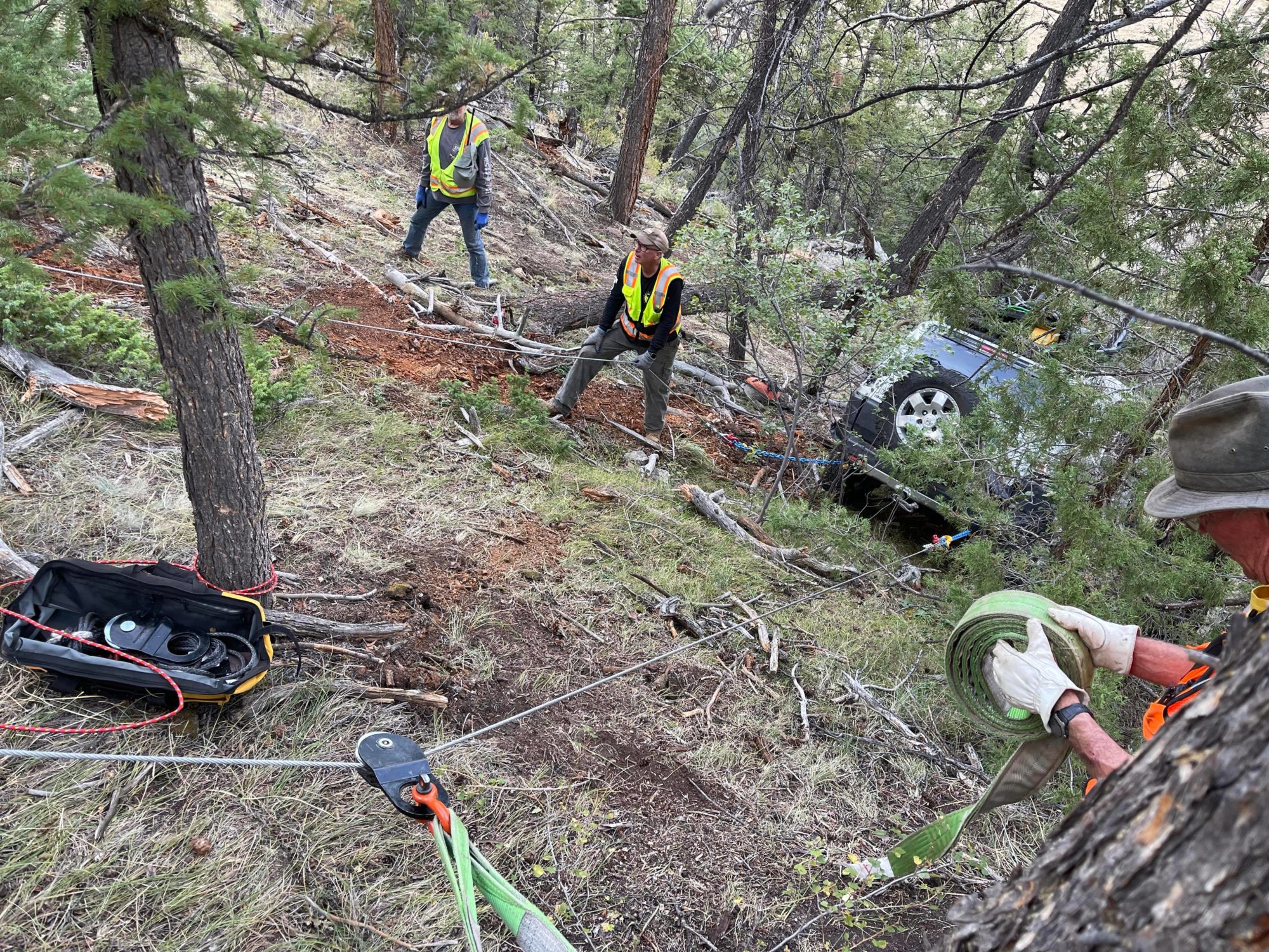 September 7th 9 AM the team began making their way down and up the hill clearing a path for the vehicle as it needed to come up a nearly 40-degree slope in spots.  By noon on the 7th, winch line was starting to be laid down the hill.  Around 2 PM the initial rigging was in place and tensioned, and the lines were inspected to make sure there wouldn’t be any issues to start recovery winching.  The first bit of winching was extremely difficult due to the trees and rocks the vehicle was hung up on.  Progress was extremely slow.  It was realized that even with numerous people on-scene, backup manpower would be needed so a page for additional responders was sent out around 5 PM.  By dinner time the FJ had been recovered uphill about 60-70 feet, with over 300 more to go, and was tied off for the night.